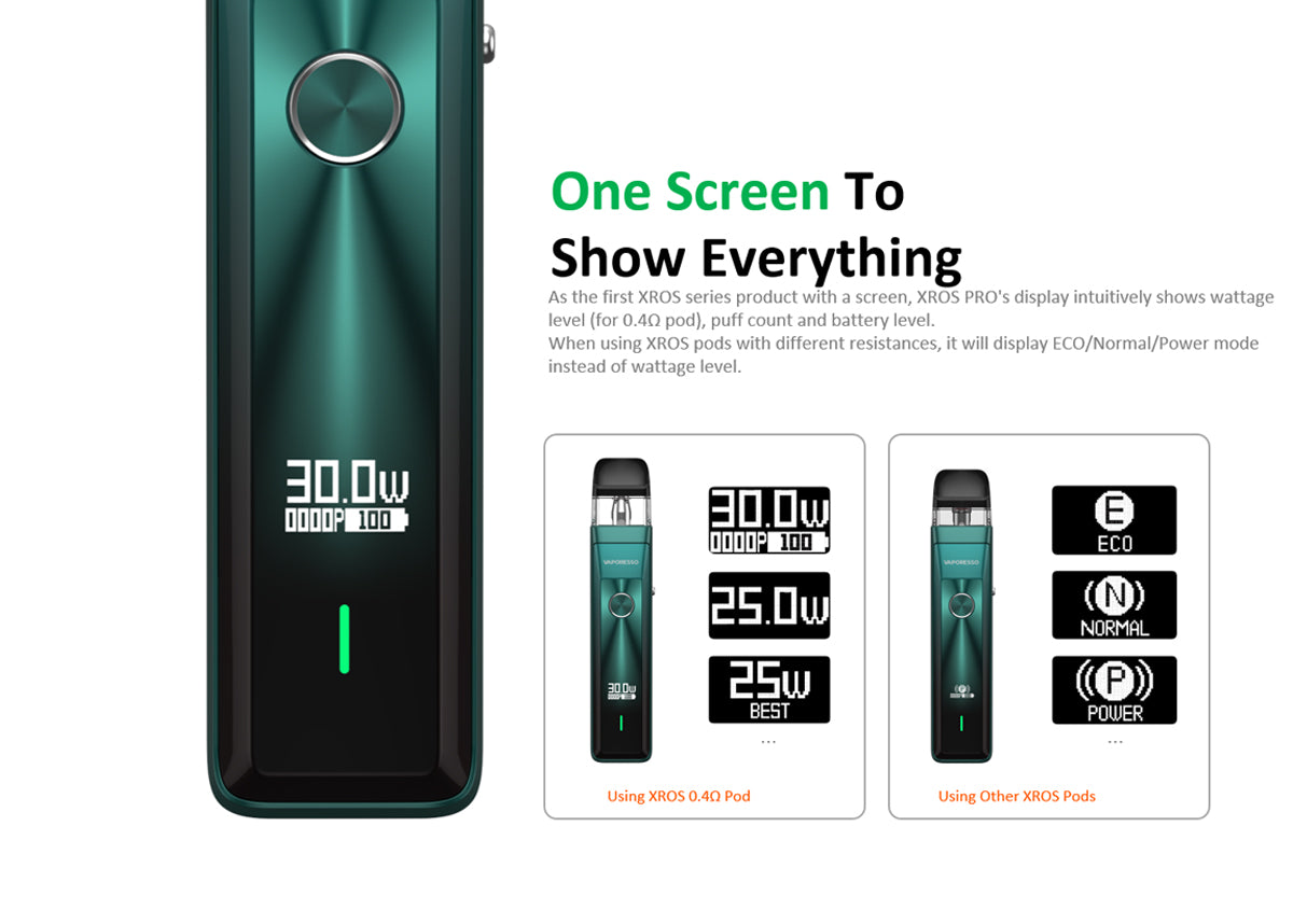 Last but definitely not least, let's talk flavour. The XROS family of built in coils pods are all compatible with the XROS Pro. As anyone who’s tried an XROS device knows, these XROS series pods are not just vessels for your vape juice; they're flavour engines thanks to Vaporesso’s Mesh Coil Corex technology, which turns every drop of your e-liquid is turned into pure, intense flavour. What’s more, with several pod options, all with a top filling design, they’re compatible with a wide range of vape juices and vaping styles. - One Screen for Everything