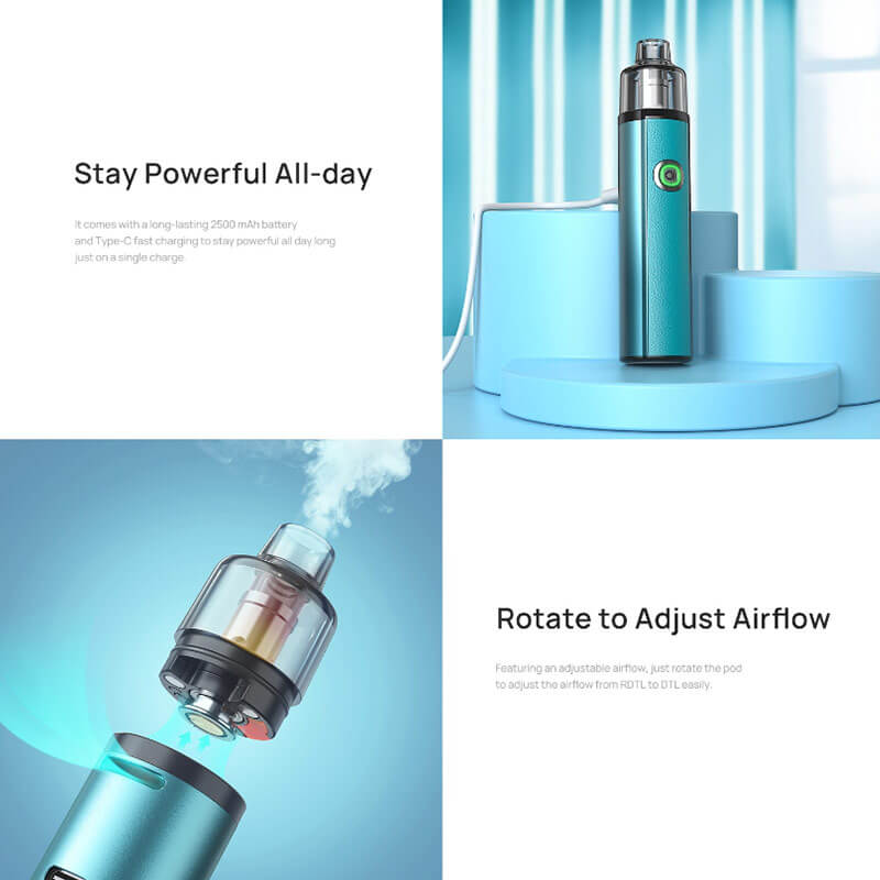 Sleek, lightweight, powerful and ergonomic 80W pod kit with rotational airflow control, 2800mAh internal battery, refillable, replaceable BO Mesh coils 2ml Pod