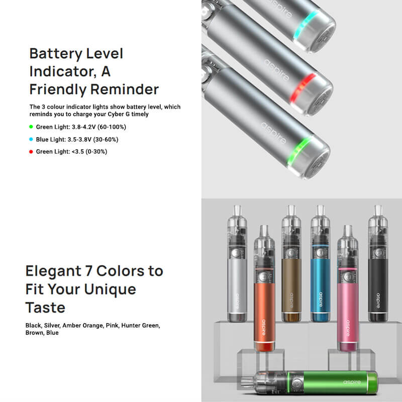 Introducing the Aspire Cyber G vape kit - a compact and stylish starter vape kit created for all day long MTL (mouth-to-lung)) vaping. With its sleek, futuristic design revealing the advanced technology inside encased in a colourful, satin-smooth chassis, this kit is ideal for vapers who want an easy-to-use, low-maintenance device that also looks amazing.