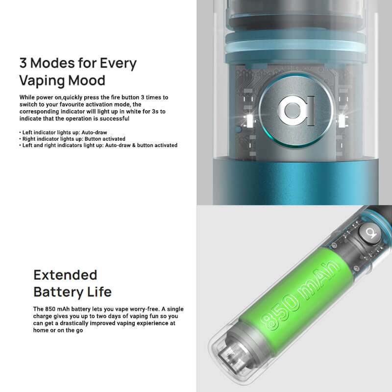 The Aspire Cyber G vape kit features an 850mAh built-in battery, offering longer usage on a single charge.