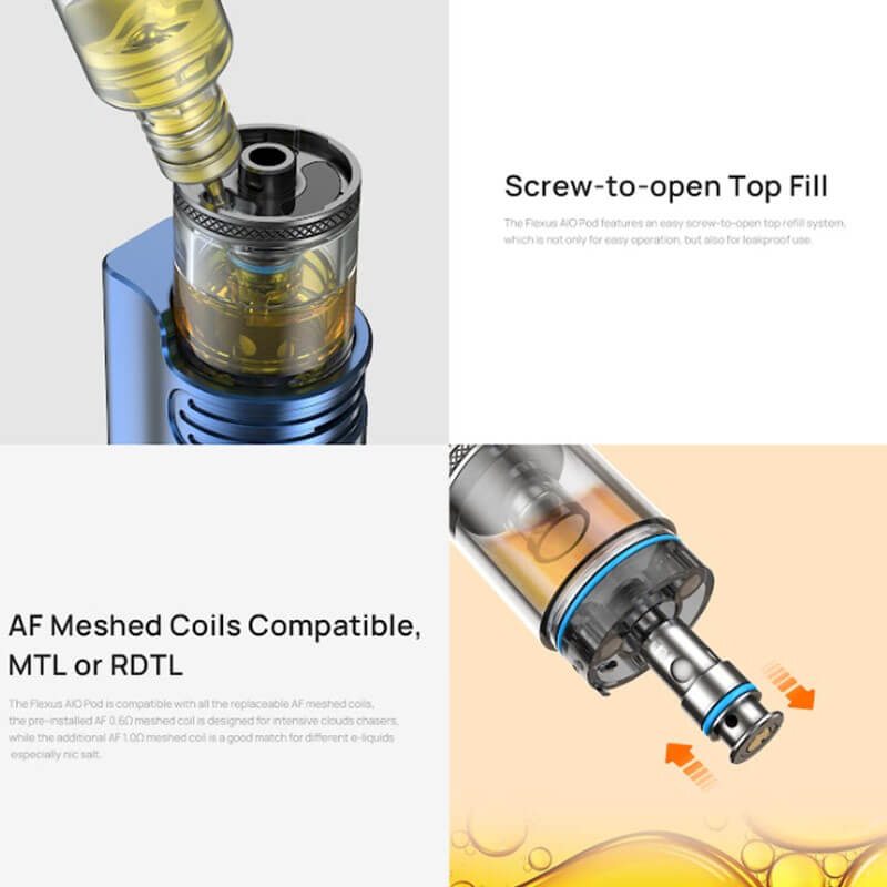 Refilling the Flexus AIO pods is just as simple, thanks to the unique top-fill design – just unscrew the mouthpiece to access the fill port - there’s no need to detach the pod. The pods are compatible with the Aspire AF coil series, offering a 1.0 Ohm coil for a tight MTL experience reminiscent of a cigarette, and a 0.6 Ohm coil for RDTL vaping with more vapour production.