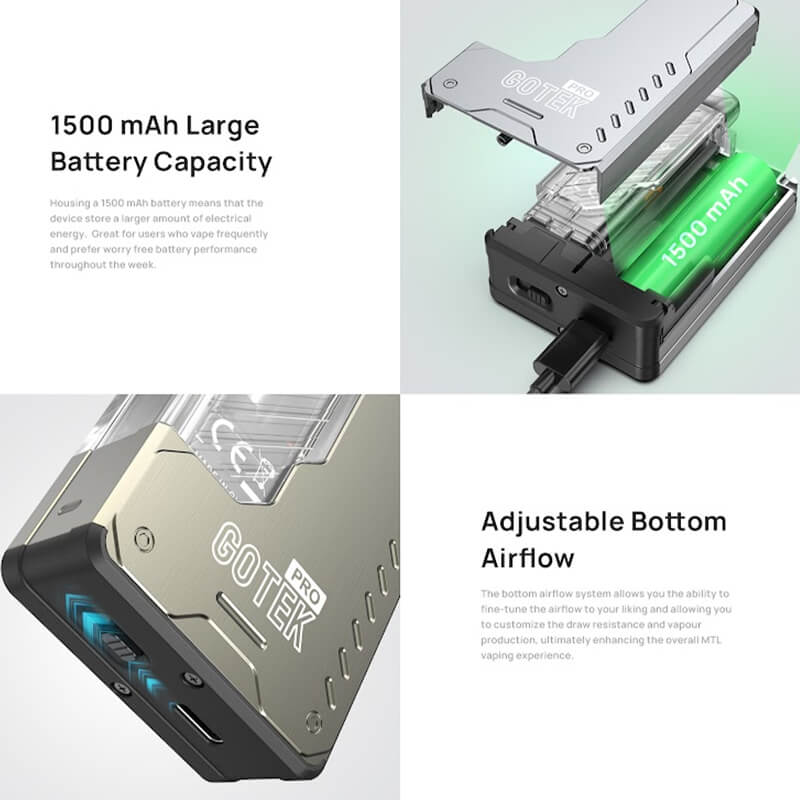 At the heart of this kit lies a powerful 1500mAh built-in battery, robust enough to sustain a full day's worth of vaping. This impressive battery capacity, combined with a power output ranging from 13-16W, ensures that the Gotek Pro delivers a consistently satisfying vaping experience throughout the day. Whether you're commuting, working, or simply enjoying a leisurely day out, this kit is designed to keep up with your lifestyle.