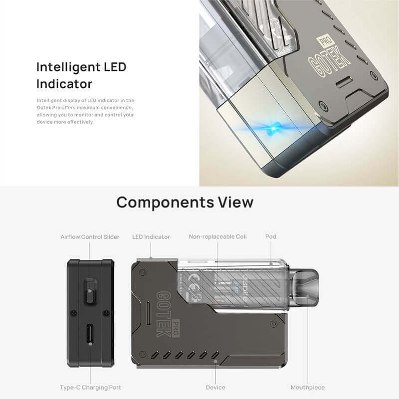 The Aspire Gotek Pro Pod Kit is a sleek, compact, and highly portable MTL (Mouth To Lung) vaping device designed for vapers who prioritize convenience and performance. The Gotek Pro sports an elegant design and pocket-friendly size, making it an ideal companion for vapers who are always on the move.