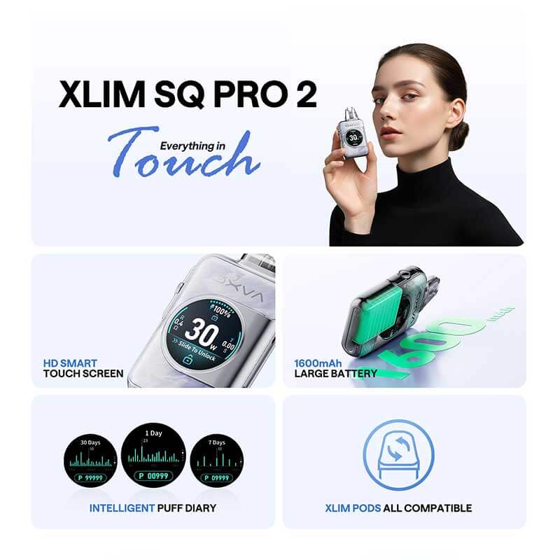 The OXVA Xlim SQ Pro 2 is a compact, high-performance pod kit that builds on the Xlim series with a host of advanced features, including a full-colour HD touchscreen, intelligent puff tracking, and ultra-fast charging. With a 1600mAh battery and up to 30W of power, this device is built for reliable, all-day MTL (mouth-to-lung) and RDL (restricted direct-lung) vaping.