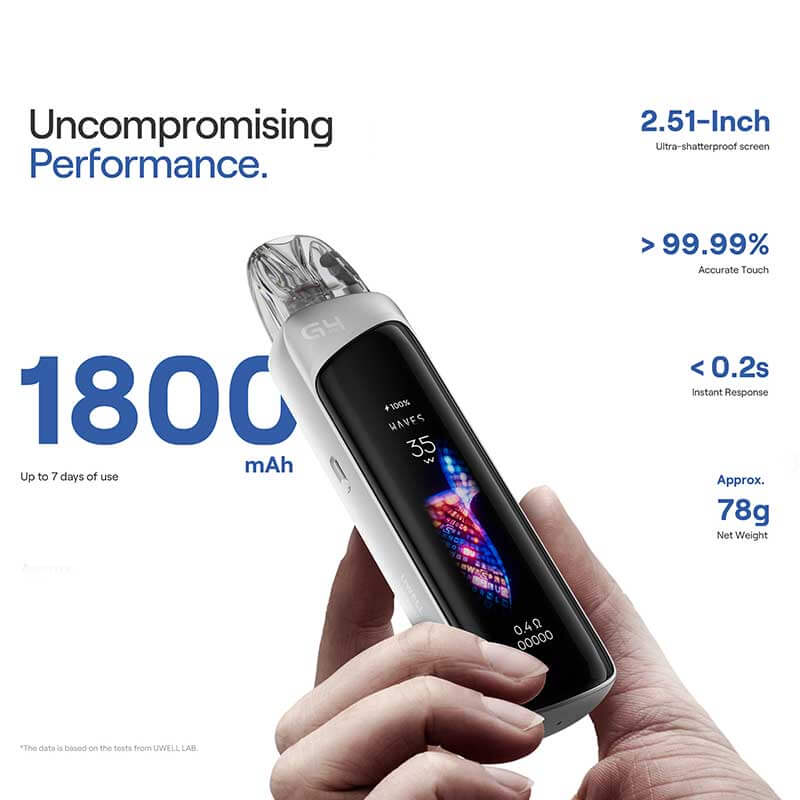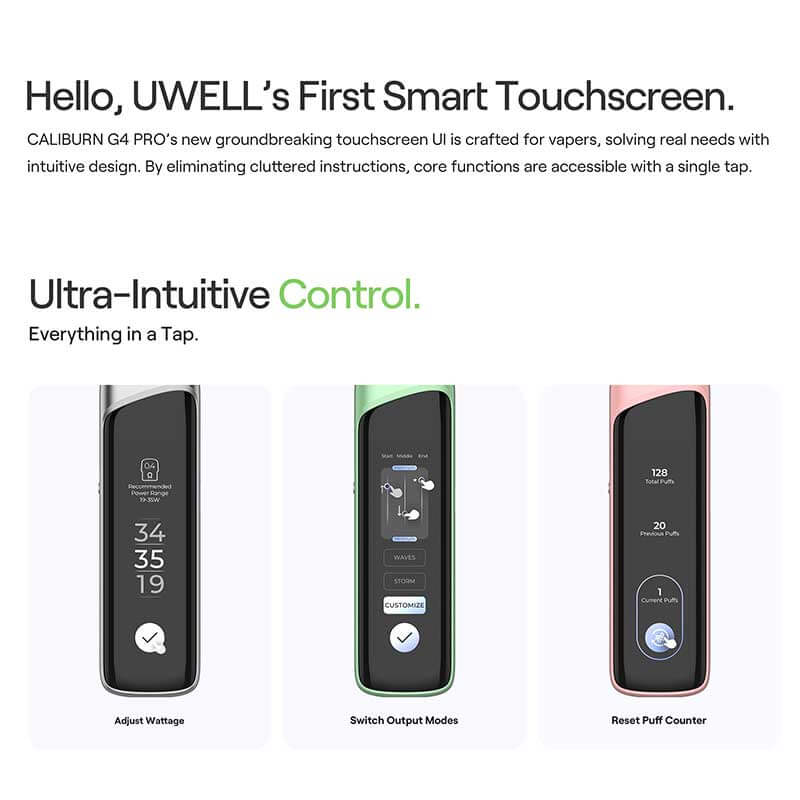 The Caliburn G4 Pro upgrades Uwell’s compact G-series with a full touchscreen interface, adjustable power up to 35W and stepless airflow control. A built-in 1800mAh battery supports fast USB-C charging, while the 2.51” touchscreen and on-screen controls make it easy to change wattage, switch modes and reset your puff counter without menus or buttons.